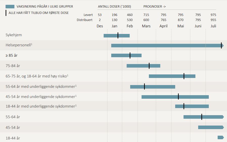 VaksineringsscenarioNår forventer vi å kunne vaksinere ulike grupper mot covid-19? Publisert av Finn David Nilsen Publisert 04.02.2021 10:40 Folkehelseinstituttet For nærmere informasjon om Koronavaksinasjonsprogrammet, se fhi.no/sv/vaksine/koronavaksinasjonsprogrammet