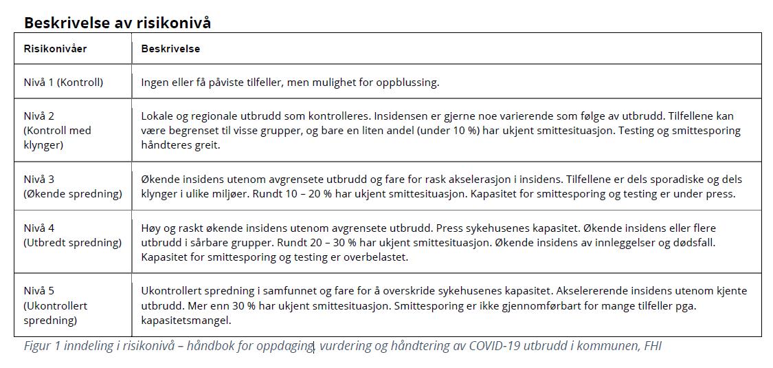 Smittestatus/Risikovurdering i Innlandet 27. januar 2021Statsforvalteren i Innlandet har en kartløsning som viser oversikt smittestatus. Det gjøres også en riskovurdering av den enkelte kommune, og av områder sett i helhet. Våler kommune ligger på N1 - Nivå 1, mens innlandet som helhet ligger på N2. Publisert av Finn David Nilsen Publisert 27.01.2021 11:55 Kartløsningen finner du her. Den ligger også som et valg på siden vår "Info om koronaviruset".