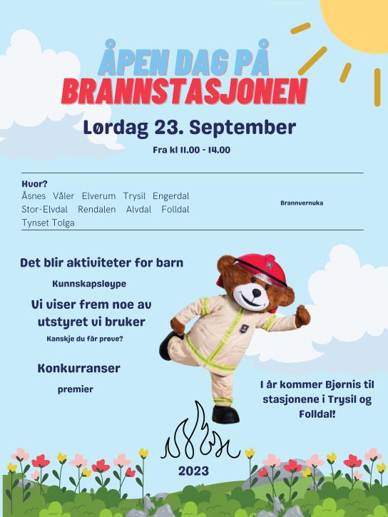 Åpen dag på brannstasjonen lørdag 23. september Åpen dag fra kl 11:00 - 14:00. Det blir aktiviteter for barn, kunnskapsløype, konkurranser med premier, og vist fram noe av utstyret som brannvesenet bruker. Publisert av Finn David Nilsen Publisert 08.09.2023 13:23