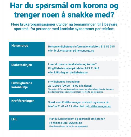 Brukerorganisasjoner utvider informasjonstilbudet til personer med kroniske sykdommerFlere brukerorganisasjoner utvider nå bemanningen for å besvare spørsmål fra personer med kroniske sykdommer per telefon. Publisert av Finn David Nilsen Publisert 24.03.2020 11:51 All informasjonen finner du på sidene til Helsedirektoratet. Last ned hele plakaten. (PDF, 2 MB)