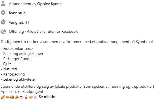 Familiedag ved KynnaOpplev Kynna og samarbeidspartnerne ønsker velkommen til familievennlig kick-start på sommerferien på Kynnbrua. Lørdag 22. juni kl. 12-16 har du mulighet til å blir med på mange av de flotte aktivitetene området har å tilby. Publisert av Finn David Nilsen Publisert 11.06.2024 07:37 Link til arrangementet FacebookHjemmeside “Opplev Kynna”