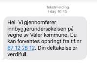 Innbyggerundersøkelsen 2021Det skal gjøres en innbyggerundersøkelse i Våler. I den forbindelsen vil du få en SMS, Publisert av Finn David Nilsen Publisert 06.10.2021 13:13 SMS'n vil se sånn ut: Du kan lese mer om undersøkelsen her.
