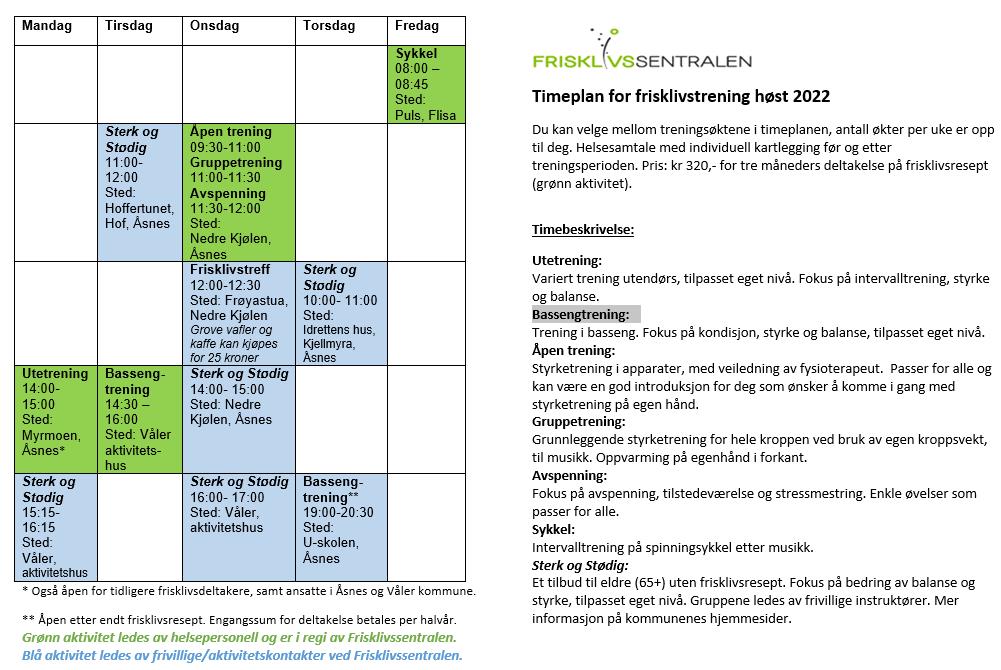 Timeplan for frisklivstrening høst 2022