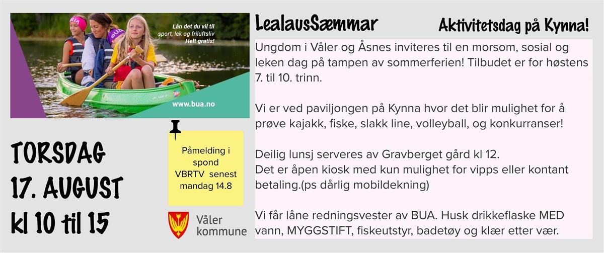 LEALAUS SÆMMAR har flere aktiviteter før skolestart! Sjekk ut https://group.spond.com/VBRTV Publisert av Eva Øiseth Wenstad Publisert 08.08.2023 16:15