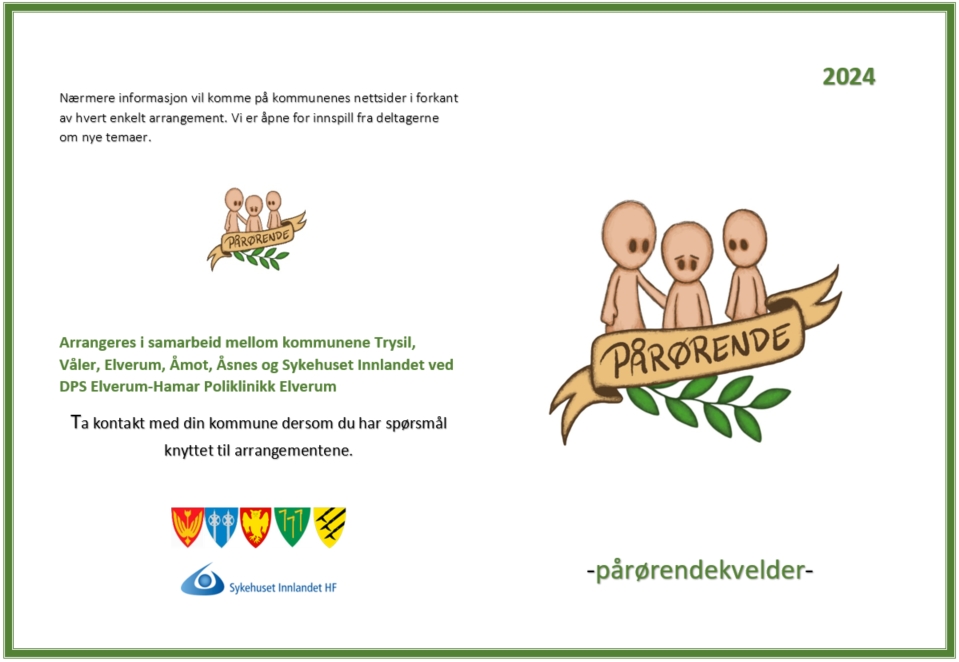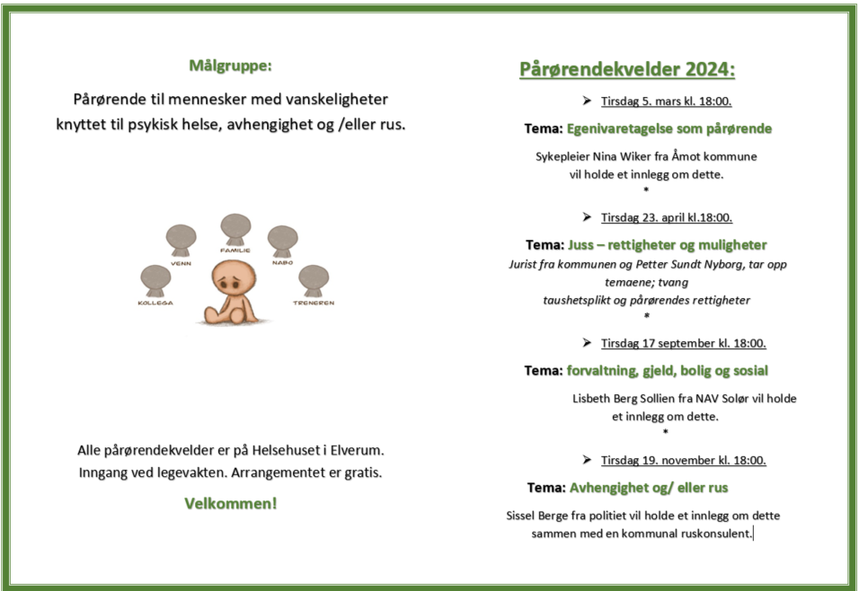 Minner om pårørendekveld tirsdag 19. november kl 18:00 Tema: Avhengighet og/ eller rus. Sissel Berge fra politiet vil holde et innlegg om dette sammen med en kommunal ruskonsulent. Målgruppe: Pårørende til mennesker med vanskeligheter knyttet til psykisk helse, avhengighet og /eller rus. Alle pårørendekvelder er på Helsehuset i Elverum. Inngang ved legevakten. Arrangementet er gratis. Publisert av Finn David Nilsen Publisert 13.11.2024 07:48 Last ned infobrosjyre som PDF. (PDF, 483 kB)