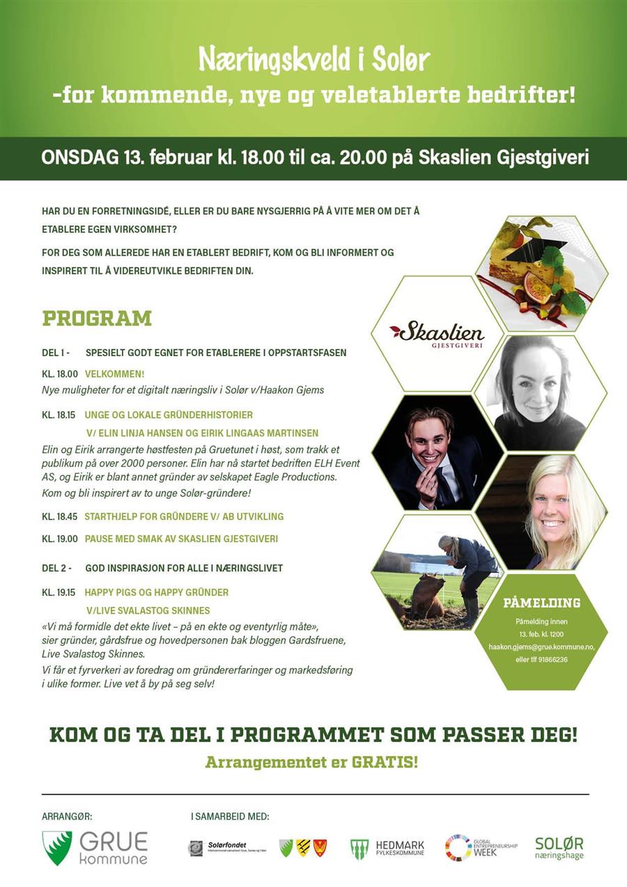 Næringskveld i Solør-for kommende, nye og veletablerte bedrifter! ONSDAG 13. februar kl. 18.00 til ca. 20.00 på Skaslien Gjestgiveri Publisert av Finn David Nilsen Publisert 06.02.2019 15:42 Hele programmet som pdf. (PDF, 735 kB)