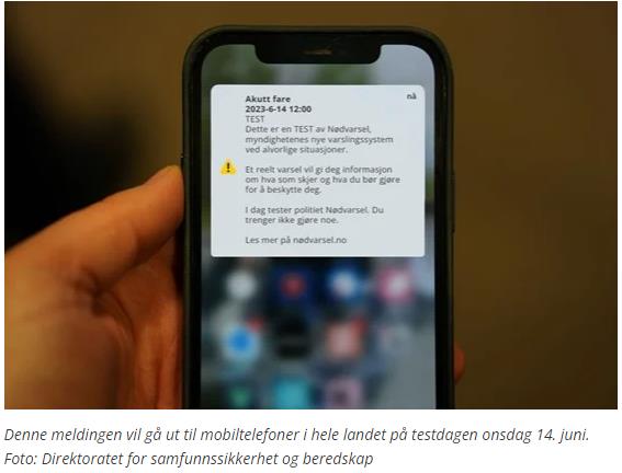 Nasjonal test av nødvarsel – høy lyd på mobiler i hele landetI midten av juni blir Nødvarsel på mobil testet mot publikum i hele Norge. Onsdag 14. juni rundt klokken 12.00 blir det gjennomført en fullskala test av det nye varslingssystemet. Publisert av Finn David Nilsen Publisert 12.06.2023 10:40 Les mer på Regjeringens nettsider. Direktoratet for samfunnssikkerhet og beredskap