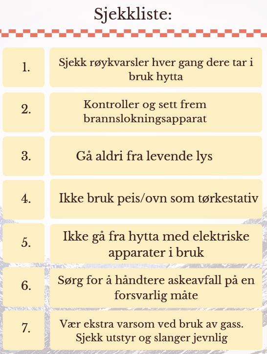 Påske - brannsikkerhet på hytteVi er nok mer bevisst på brannsikkerhet hjemme enn på hytta. Kravene til brannsikkerhet er likevel de samme og likeså viktig. Her er en sjekkliste fra Midt-Hedmark brann- og redningsvesefor alle som skal på hytta i påsken. Publisert av Finn David Nilsen Publisert 22.03.2024 13:36 Last ned som PDF (PDF, 10 MB)Sjekkliste for alle som skal på hytta i påsken