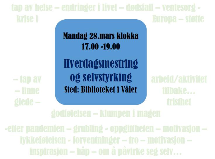 Temakveld "Hverdagsmestring og selvstyrking "Mandag 28.mars klokka 17.00 -19.00. Sted: Biblioteket i Våler. Arrangør: Psykisk helse- og rustjeneste i Våler. Enkel bevertning. Alle interesserte kan møte opp. Publisert av Finn David Nilsen Publisert 22.03.2022 10:14 Hele invitasjonen som .pdf (PDF, 359 kB)