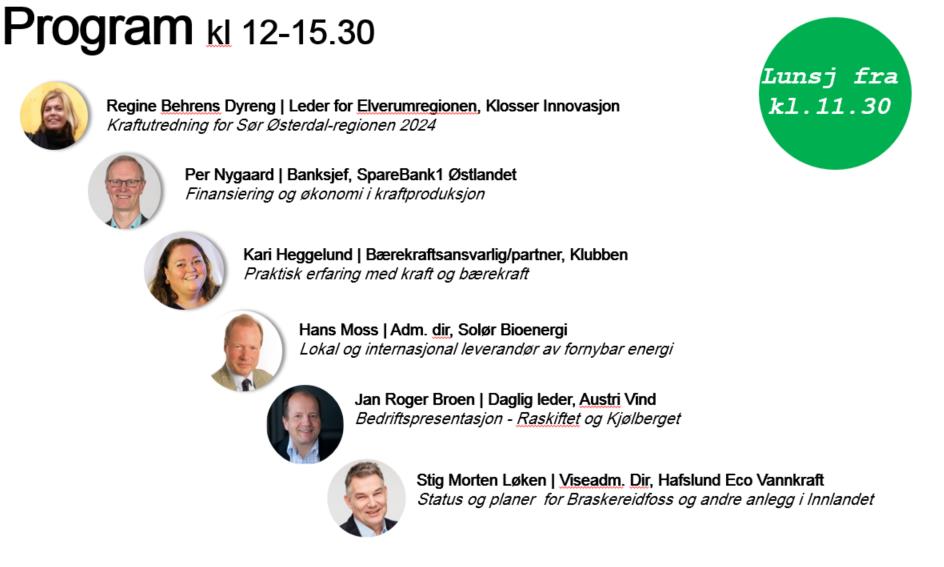 I regi av Våler kommune , Klosser Innovasjon samt Sirkulære Solør og industrinettverket 6Kloke inviterer vi næringslivet, politikere og samfunnsengasjerte personer i regionen til et oppdatert og viktig innblikk i verdikjeden for kraftproduksjon. Vi har satt sammen et svært godt lag som dekker kraftproduksjon,finansiering, bruk og gjenbruk med lokale og regionale eksempler. Velkommen til faglig og sosialt sommertreff! Sted: NAF Trafikksenter, Braskereidfoss, 24. juni, kl.11.30-15.30. Påmelding innen 20. juni til: arild.lande@vis.kommune.no / tlf: 901 33 674. Arrangementet er gratis.