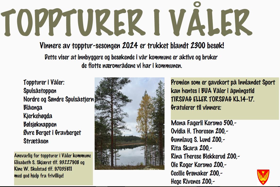 Vinnere av topptur-sesongen 2024 er trukket blandt 2300 besøk!Dette viser at innbyggere og besøkende i vår kommune er aktive og bruker de flotte nærområdene vi har i kommunen. Publisert av Finn David Nilsen Publisert 08.10.2024 10:52