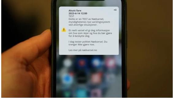 Nasjonal test av nødvarsel – høy lyd på mobiler i hele landet I midten av juni blir Nødvarsel på mobil testet mot publikum i hele Norge. Onsdag 14. juni rundt klokken 12.00 blir det gjennomført en fullskala test ... Publisert 12.06.2023 kl. 10:40