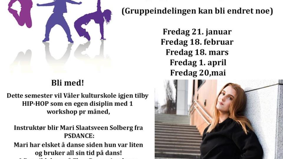 Dans er tilbake i kulturskolen! Våler kulturskole starter opp igjen med hip-hop som egen disiplin.Undervisningen gis som 5 workshops i samarbeid med PSDANS og datoer for Workshops de... Publisert 17.01.2022 kl. 13:28
