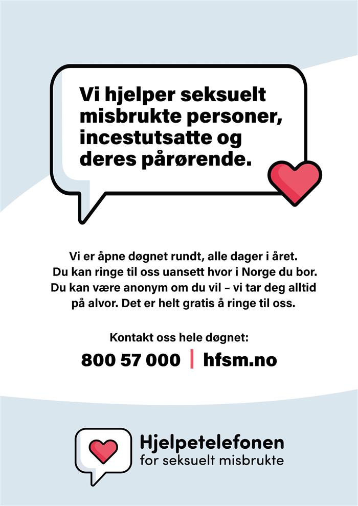 Her er Hjelpetelefonen for seksuelt misbrukte telefonnummer og webside: Tlf: 800 57 000 webside: https://hfsm.no/